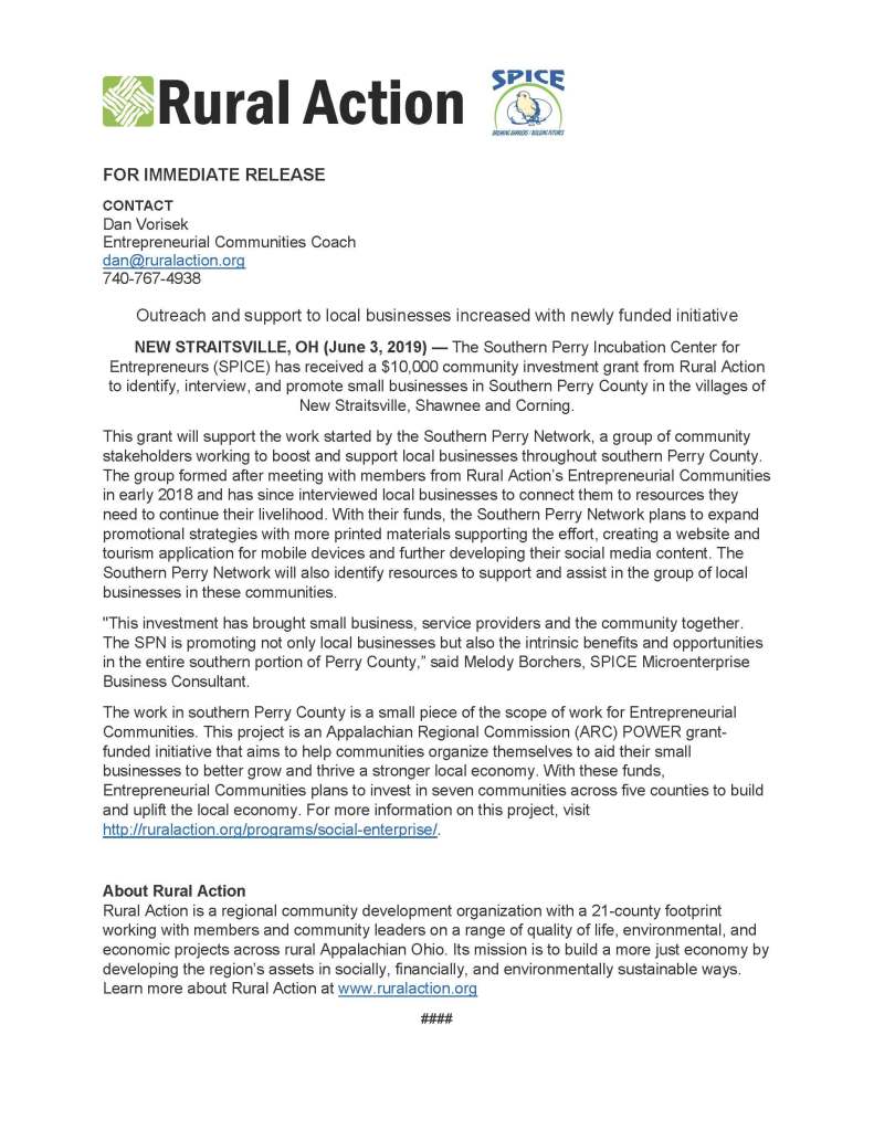 SPN is one of seven communities across five counties that have been designated Entrepreneurial Communities by Rural Action as part of the ARC Power grant. With Rural Action’s assistance, SPN has begun the process of interviewing local businesses to identify the benefits, opportunities and barriers to operating a business in southern Perry County. The businesses surveyed also share the needs of their individual business that prevent growth. SPN then helps to identify and contact resources that can assist and solve these challenges for the business owner.